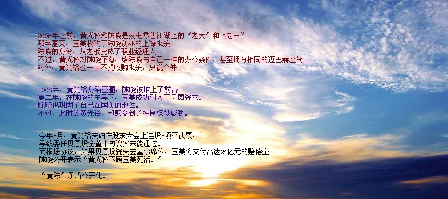 第一宗罪:趁人之危。公開信說,陳曉在黃光裕危難之時,聯手貝恩資本,簽訂了極為苛刻的融資協議,企圖變“國美電器”為“美國電器”。
