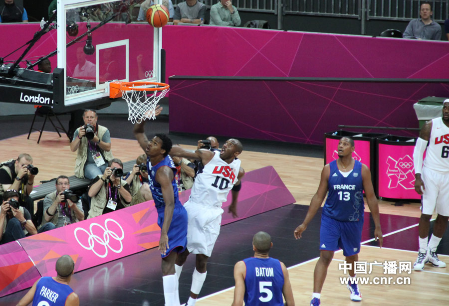 首節(jié)比賽,夢(mèng)十不斷用快攻得分。首節(jié)還有6分42秒時(shí),美國搶斷之后快速反擊,杜蘭特剛過罰球線就跳起,滑翔之后單手暴扣得分,連投帶罰拿下3分,美國以11-5領(lǐng)先。法國靠帕克組織進(jìn)攻,一點(diǎn)點(diǎn)將比分扳回。在帕克率領(lǐng)下,法國本節(jié)只以21-22落后。