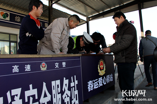在春運(yùn)交通安全服務(wù)站,民警正在登記檢查。長城網(wǎng) 高琳哲 攝