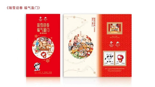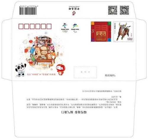 《瑞雪迎春 福氣盈門》拜年封卡折套裝由一枚貼有辛丑年生肖郵票的拜年紀(jì)念封和插有拜年郵票與吉祥物郵票的郵折組成。郵折內(nèi)含《北京2022年冬奧會(huì)吉祥物和冬殘奧會(huì)吉祥物》郵票一套2枚,《拜年》郵票一套1枚,既可作為賀卡郵寄,也可作為春節(jié)紅包插放壓歲錢