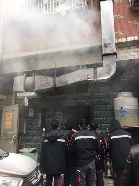當時飯店還沒有開門,兩人圍著飯店找了一圈才發現,是后門廚房的油煙機著火了。火勢已經很大,兩人沒多想,立馬跑回單位取滅火器,并呼叫救援。再次折回的二人抱著滅火器就沖進了火場。