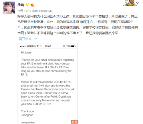 對此,徐嬌經(jīng)過天人交戰(zhàn)之后,雖然內(nèi)心十分矛盾,但是為了兼顧學(xué)業(yè)和工作,她決定2017年的春季學(xué)期繼續(xù)請假,這并不代表不用上這學(xué)期的課,她依舊得上滿8個學(xué)期才能畢業(yè),連帶秀出3張與學(xué)校的英文書信,做為證明學(xué)校已經(jīng)通過給予額外的請假天數(shù),也向粉絲保證日后會更加努力。