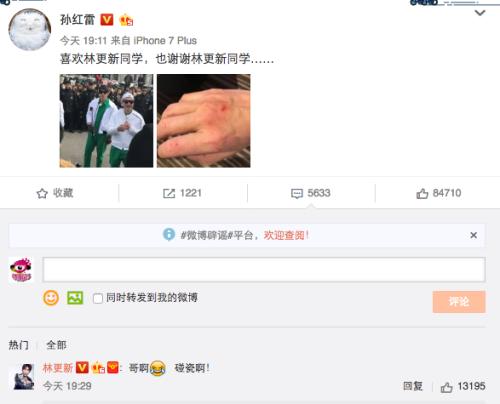 日前,孫紅雷分享了和林更新一起錄制《極限挑戰》的照片,并一同曬出自己擦傷明顯、多處流血的右手,配文稱:“喜歡林更新同學,也謝謝林更新同學……”林更新隨后轉發并回復孫紅雷,“哥啊,碰瓷啊!”圖片中,孫紅雷與林更新正在錄制中,孫紅雷舉起右手指點傷疤,嬉笑著和面前的人解釋,林更新位于他身后,看不出表情。