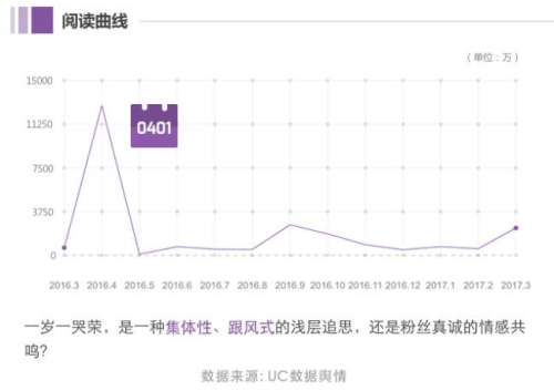 無獨有偶,UC閱讀數據圖也顯示,每年張國榮話題熱度的波峰是在4月1日前后,其余時間熱度較低,有粉絲表示“一歲一哭榮”已經從一個忠實粉絲自發緬懷偶像的事件變成了一場自媒體和企業借勢的“營銷熱點”和網友跟風的淺層追思。