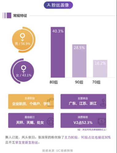 此次,UC根據粉絲所在地、年齡、性別等大數據提供了一份粉絲畫像。據大數據顯示,粉絲主要來自廣東等沿海城市,多為白領階層,淘寶網購消費水平較高。粉絲構成中,90后不斷加入粉絲大軍,占比接近30%,其中,天秤座的粉絲最多。