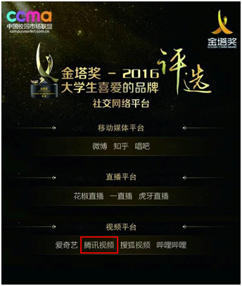 2017中國(guó)校園市場(chǎng)年度峰會(huì)暨金塔獎(jiǎng)是在中國(guó)青少年新媒體協(xié)會(huì)和全國(guó)學(xué)校共青團(tuán)新媒體運(yùn)營(yíng)中心的指導(dǎo)下,由中國(guó)校園市場(chǎng)聯(lián)盟等組織和企業(yè)聯(lián)合協(xié)辦的校園市場(chǎng)行業(yè)最權(quán)威的獎(jiǎng)項(xiàng)。此次頒獎(jiǎng)典禮上,騰訊視頻喜獲“2016年度大學(xué)生喜愛(ài)的視頻平臺(tái)”榮譽(yù),當(dāng)之無(wú)愧地成為當(dāng)代大學(xué)生認(rèn)同又認(rèn)可的內(nèi)容平臺(tái),也是影響年輕群體核心價(jià)值觀的重要渠道。