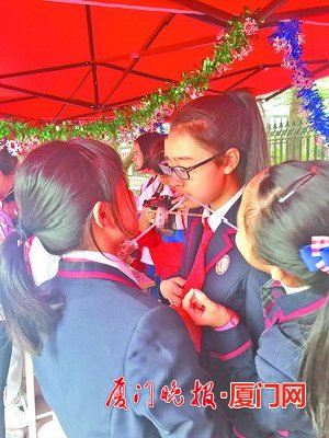 六年(2)班的陳錦璇和賴鷺宸在攝影社的攤位前玩起游戲,她們嘴里含著吸管,用吸管傳遞一個(gè)透明膠。經(jīng)過(guò)了三分鐘的嘗試,她們終于圓滿完成了任務(wù)。“嘴巴都酸死啦!”陳錦璇開心地說(shuō),工作人員在她們的積分卡上蓋了一個(gè)小紅章,據(jù)說(shuō),完成任務(wù)蓋滿12個(gè)紅章就可以拿到獎(jiǎng)品了。