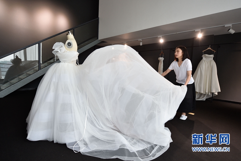 4月26日,蔡萍萍在工作室修改一件定制婚紗樣品。新華社記者 宋為偉攝 -