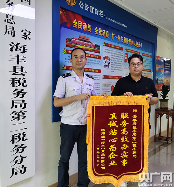央廣網(wǎng)汕尾10月26日消息(記者官文清 通訊員陳思宇 童振躍)“海豐稅務(wù)人員主動(dòng)上門指導(dǎo)留抵退稅事宜,僅用兩天時(shí)間退稅款就到我們賬戶了,真金白銀落袋,為我們解決了復(fù)工后資金周轉(zhuǎn)的實(shí)際困難!苯,華耀城(海豐)置業(yè)有限公司將一面印有“服務(wù)高效辦實(shí)事,真誠貼心為企業(yè)”的錦旗送至海豐縣稅務(wù)局第二稅務(wù)分局,對稅務(wù)人員真誠貼心、全面提速為企業(yè)排憂解難的服務(wù)表示充分肯定及衷心感謝。