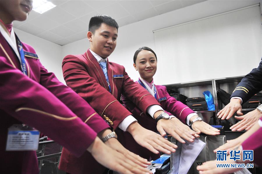 2月1日,在南航海口美蘭基地,梁鶴(右)在出發前為丈夫寧儒整理著裝。新華社發(楚洪雨 攝) 春運首日,南航90后夫妻乘務員寧儒和梁鶴共同執行從海口至哈爾濱的航班任務,一同在崗位上開始了春運的忙碌。小兩口于2015年入職南航,工作后相識相戀,于2017年結婚。 -