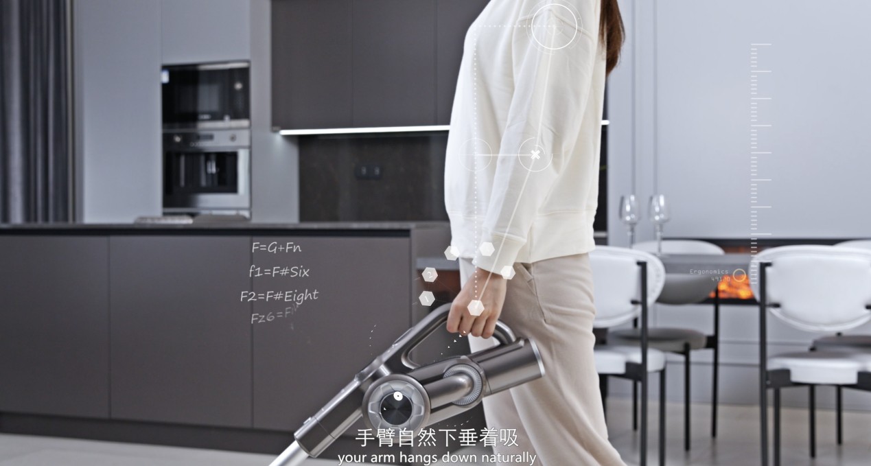 該設計符合人體工程學省力原理,機器順勢提在手上,清潔不累手。而傳統的吸塵器多為側手把設計,使用時需要手臂彎曲發力,容易造成手部酸痛。