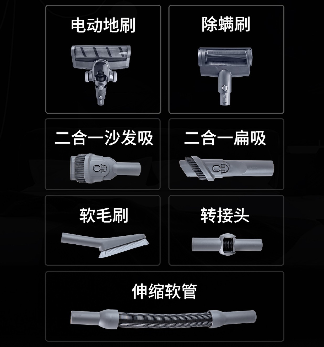 搭配多種刷頭,全屋清潔:地面、沙發、桌面、書柜、車內、床底低矮空間。