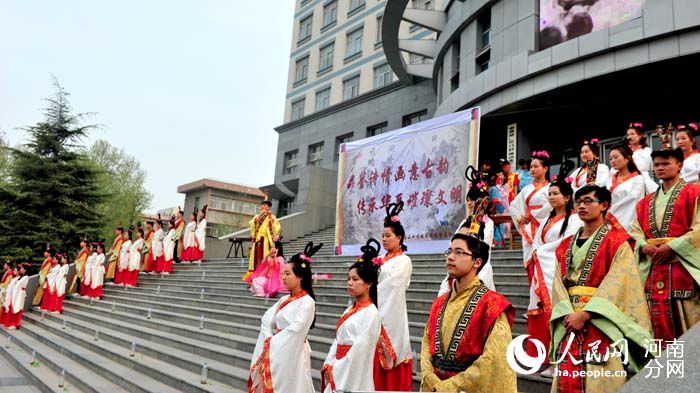 央廣網(wǎng)河南分網(wǎng)消息 據(jù)人民網(wǎng)報(bào)道:華麗的漢服、優(yōu)雅的禮儀技巧、曼妙的舞姿、古韻悠長的國學(xué)誦讀……又是一年清明時(shí),在河南農(nóng)業(yè)大學(xué)文化路校區(qū),一場由該校食品科學(xué)技術(shù)學(xué)院舉辦的古裝傳統(tǒng)文化禮儀活動(dòng)精彩上演。