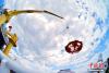 16名中國航天員和2名歐洲航天員,8月21日在山東省煙臺市附近海域圓滿完成了為期17天的海上救生訓練任務。圖為訓練期間,8月2日,航天員乘坐救生吊籃。 中新社發 朱九通 攝 -