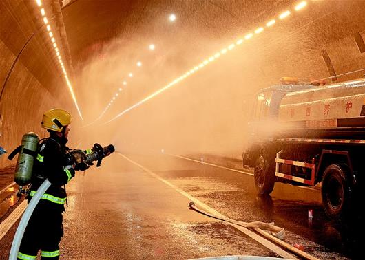 11月16日,省交通運輸廳在鄂西高速“荊楚第一隧”——金龍隧道舉行反恐綜合應急演練。上午9時,1名“恐怖分子”駕車至金龍隧道入口處縱火,鄂西管理處、路政、高警、公安、消防、長陽縣政府安全應急辦等多部門聯(lián)勤聯(lián)動,成功處置了應急“險情”。圖為隧道內,消防員對事故車輛進行滅火作業(yè)。(視界網 何祝青 攝)