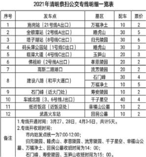 祭掃專線開通時間為3月27日、28日,4月3日至5日,共5天。共有13條專線,在市內(nèi)設(shè)有12個乘車點,分別開往歸元陵園、睡虎山、孝恩陵園、流芳陵園、千子星空、幸福山公墓、萬福凈土、石門峰、壽安陵園、玉筍山、回民公墓等墓區(qū)。