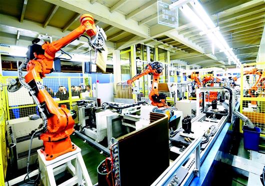 湖北日報訊 圖為美的集團武漢制冷設備有限公司智能制造生產線上的機器手臂在運行。(記者 張朋 攝)