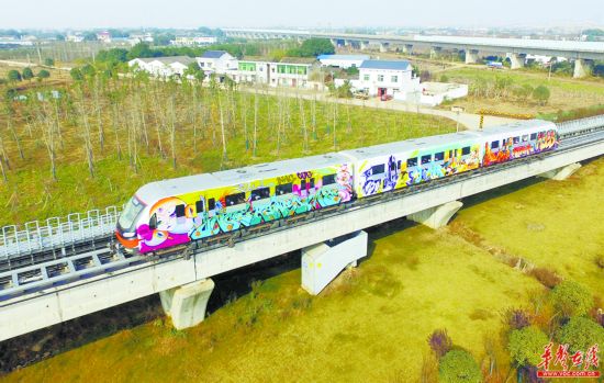 12月15日上午,畫滿涂鴉的磁浮專列從長沙榔梨站經過。當天,該專列完成“變裝”,從湖南磁浮公司綜合檢修庫駛出,與廣大市民朋友見面。列車兩面的作品由來自國內外的20位涂鴉大師聯手創作,3節車廂共繪有6幅涂鴉作品,創作者通過構圖彼此獨立、主題相互呼應的彩色涂鴉,突出城市幸福感和軌道交通的綠色發展理念。