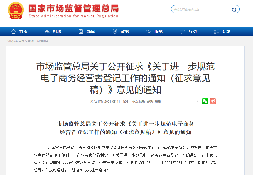 央廣網北京5月11日消息(記者 牛谷月)記者從市場監管總局官網獲悉,為服務規范電子商務經濟發展,推進市場主體登記注冊便利化,市場監管總局制定了《關于進一步規范電子商務經營者登記工作的通知(征求意見稿)》(以下簡稱“意見稿”),即日起向社會公開征求意見。