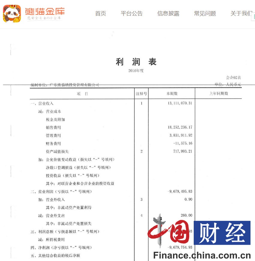 中國(guó)網(wǎng)財(cái)經(jīng)記者發(fā)現(xiàn),在亮眼的成交數(shù)據(jù)背后,熊貓金庫(kù)卻面臨虧損。據(jù)其官方網(wǎng)站披露的《廣東熊貓鎮(zhèn)投資管理有限公司2016年度審計(jì)報(bào)告》(以下簡(jiǎn)稱“審計(jì)報(bào)告”)顯示,2016年熊貓金庫(kù)營(yíng)業(yè)收入為1311.11萬(wàn)元,凈利潤(rùn)為-967.96萬(wàn)元。
