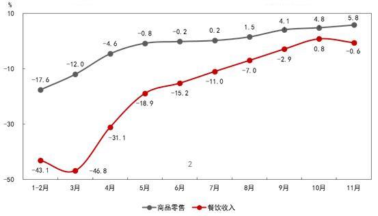 城鄉(xiāng)市場(chǎng)穩(wěn)定復(fù)蘇。11月份,城鎮(zhèn)和鄉(xiāng)村消費(fèi)品零售額同比分別增長(zhǎng)4.9%和5.6%,增速分別比10月份加快0.7和0.5個(gè)百分點(diǎn),城鄉(xiāng)市場(chǎng)銷售均連續(xù)四個(gè)月同比正增長(zhǎng)。11月份,鄉(xiāng)村消費(fèi)品零售額增速高于城鎮(zhèn)0.7個(gè)百分點(diǎn),鄉(xiāng)村市場(chǎng)恢復(fù)好于城鎮(zhèn)。