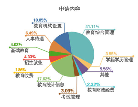 報(bào)告顯示,1月1日至12月31日,共收到公民、法人和其他組織通過(guò)各種形式提出的信息公開(kāi)申請(qǐng)647件,較2014年的281件增長(zhǎng)了130%。從申請(qǐng)的主體看,公民個(gè)人提出的申請(qǐng)626件、其他組織提出的申請(qǐng)21件。從申請(qǐng)方式看,當(dāng)面申請(qǐng)16件,占2.47%;以電子郵件方式申請(qǐng)31件,占4.79%;以紙質(zhì)信函方式申請(qǐng)65件,占10.05%;以在線提交方式申請(qǐng)535件,占82.69%。涉及教育綜合管理的266件,占41.11%;涉及教育統(tǒng)計(jì)信息的114件,占17.62%;涉及教育機(jī)構(gòu)設(shè)置的65件,占10.05%;涉及人事待遇的42件,占6.49%;涉及招生就業(yè)的28件,占4.33%;涉及基礎(chǔ)教育的26件,占4.02%;涉及學(xué)籍學(xué)歷管理的23件,占3.55%;涉及考試管理的20件,占3.09%;涉及教育財(cái)政經(jīng)費(fèi)的15件,占2.32%;涉及教育收費(fèi)的12件,占1.86%;其他36件,占5.56%。申請(qǐng)內(nèi)容涉及教育部20個(gè)業(yè)務(wù)司局。