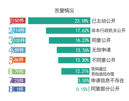 報(bào)告顯示,647件申請(qǐng)已全部按時(shí)答復(fù)申請(qǐng)人,其中“已主動(dòng)公開(kāi)”的150件,占23.18%;“同意公開(kāi)”的105件,占16.23%;“同意部分公開(kāi)”的1件,占0.15%;“不同意公開(kāi)”的86件,占13.30%;“不屬于本行政機(jī)關(guān)公開(kāi)”的114件,占17.62%;“申請(qǐng)信息不存在”的23件,占3.55%;“告知通過(guò)其他途徑辦理”的79件,占12.21%,無(wú)效申請(qǐng)89件,占13.76%)。