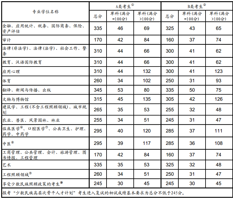 2017年全國碩士研究生招考考生進入復試的初試成績基本要求(專業學位類)