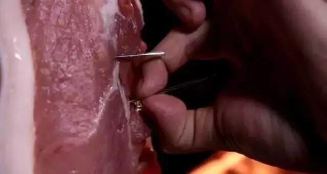 用一塊豬肉來(lái)模擬人體,兩枚鋼針深深地插入到豬肉里面,淺的一根針插入豬肉,深的一枚插入達(dá)到4公分↓