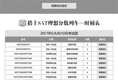 北京越來越多的公立學校開設了國際部、出國班,被稱為“洋高考”的SAT、ACT考試歷來是中國學生申請去美國留學前必須要參加的重要考試。北京青年報記者近日發(fā)現(xiàn),由于內(nèi)地沒有SAT、ACT考點,考生必須要遠赴境外趕考。隨之而起的一種名為“SAT考團”的商業(yè)項目已經(jīng)潛入了北京高中生之中。他們在旅行社推出的“SAT考團”或是學校組織的SAT考團帶領下,遠赴香港、澳門、臺灣地區(qū),或是日本、韓國、泰國、新加坡等周邊國家的考點參加美國“洋高考”。