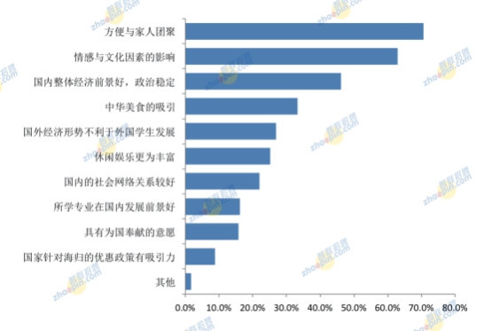 此外,調查結果顯示,海歸中獨生子女占比七成,為70.8%,非獨生子女的占比僅為29.2%。獨生子女比例偏高。隨著我國老齡化加劇,照顧父母、家庭團聚等因素將成為留學人員中的獨生子女歸國發展的重要原因。