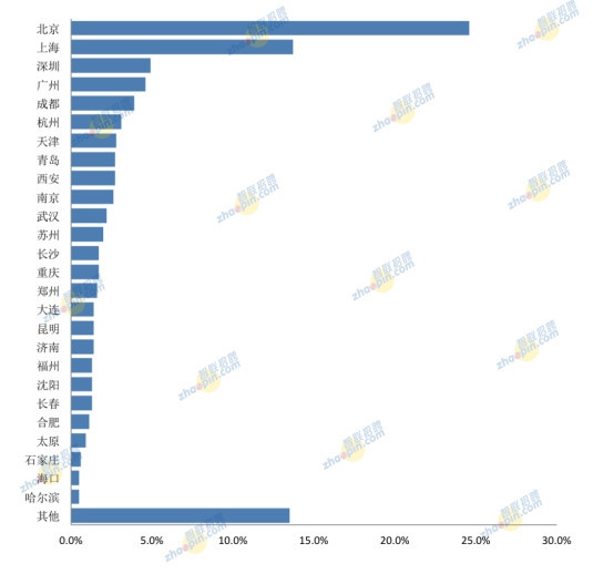 從海歸出生地來看,北京穩居首位,且比例遠遠超過其它地方。上海、鄭州、廣州、西安、成都居前六位。其它各城市占比依次遞減,但差距微小,且地域涵蓋我國東、中、西各地區。