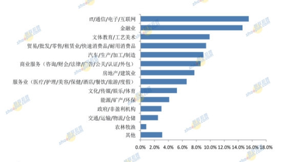 在就職行業方面,位居前五名的依次為IT/通信/電子/互聯網、金融業、文體教育/工藝美術、貿易/批發/零售/租賃業/快速消費品/耐用消費品、汽車/生產/加工/制造,占比分別為15.5%、14.6%、9.9%、9.4%、9%。此外,能源/礦產/環保、政府/非盈利機構、交通/運輸/物流/倉儲、農林牧漁四個行業,占比均在5%以下。