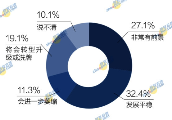 在對目前單位所在行業未來十年發展前景的看法上,海歸群體整理持樂觀態度,認為非常有前景的占27.1%,發展平穩的占32.4%,將會轉型升級或洗牌的占19.1%,認為會進一步萎縮的占11.3%,另有10.1%認為說不清。
