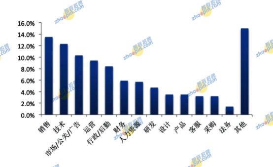 海歸就業的工作崗位類型分布中,排名前五分別是銷售、技術、市場/公關/廣告、運營、行政/后勤,占比依次為13.5%、12.3%、10.3%、9.4%、8.4%。其次是財務、人力資源和研發,占比分別為5.9%、5.7%和4.7%。設計、產品等崗位占比均低于4%。