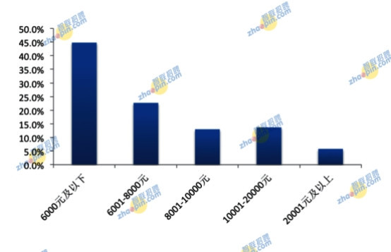 本次調研中發現,海歸初次就業的工資分布中,6000元及以下的占比最大,為44.8%,6001-8000元的占比22.7%,8000-10000元、10001-20000元的分別占比13.0%和13.7%。20001元及以上的占比僅為5.8%。