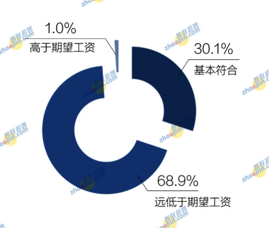 當被問及實際工作收入與個人期望是否一致時,認為高于期望的僅為1%,認為基本符合的占比30.1%,認為遠低于期望工資的占比68.9%。