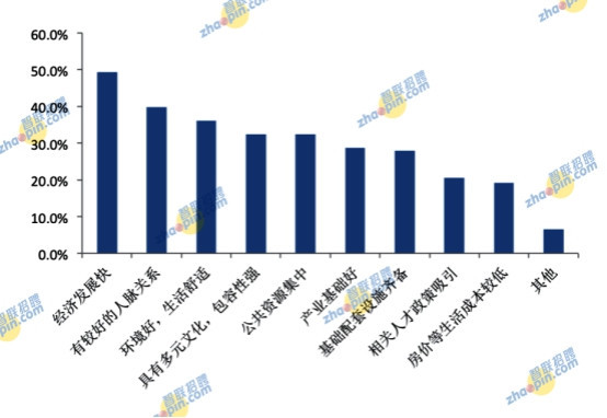選擇創業城市的理由呈多樣化特征。其中經濟發展、人脈關系、環境舒適、文化多元包容性強、公共資源集中五類原因排名靠前,占比依次為49.3%、39.7%、36%、32.4%、32.4%。可以看到,城市發展的軟實力更受海歸創業者關注。其次,產業基礎、配套設施、人才政策、房價等生活成本,占比分別為28.7%、27.9%、20.6%、19.1%。