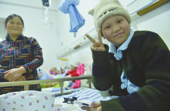 11月21日,醫院病房,13歲的女孩蒙欣笑對病魔。