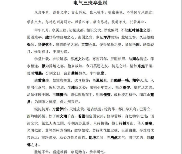 說寫就寫的王一鳴,僅用了一個下午就完成了這篇作品,發在班級群里,讓大家提提建議,同學們紛紛夸贊王一鳴有心、有文采,都說這是收到的最棒的畢業禮物,并且要把這篇《電氣三班畢業賦》印在畢業冊上。