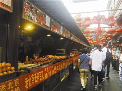 王府井小吃街管理方的一位負責人告訴北青報記者,這些名不副實的“老北京小吃”攤點并不在小吃街上。據他介紹,小吃街對商戶的店鋪裝修、招牌名稱都有規定,統一采用了木質牌匾加傳統彩旗的裝修風格,與北青報記者反映的小吃攤經營方式完全不同。