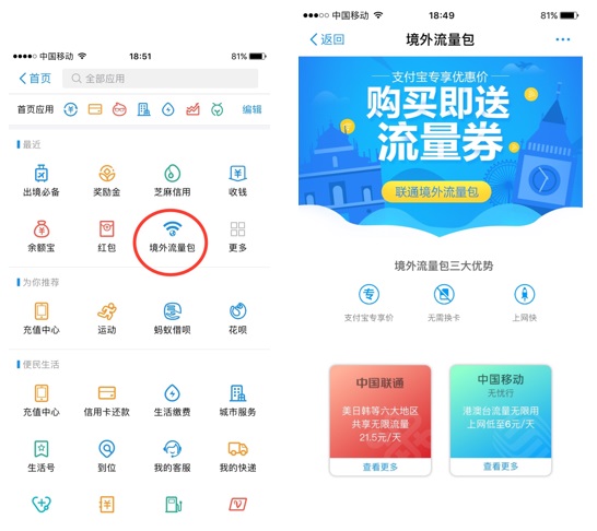 境外最常碰到一個問題是:手機漫游上網太貴,卻又不方便換當地的電話卡。其實,可以用支付寶解決。支付寶有個境外流量包服務,你可以在里面一鍵購買港澳臺,甚至美國、日本和韓國的流量包,無需換卡就能在境外能上網,支持的地區最低僅6元/天。