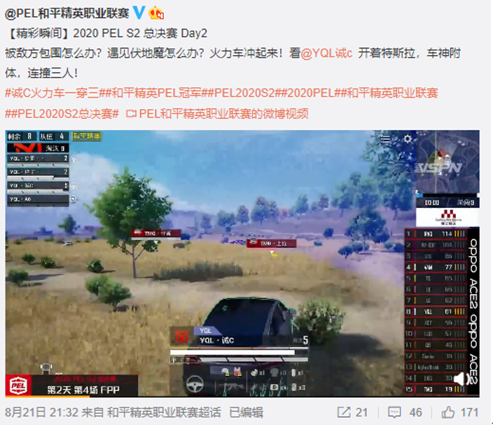 在首周的PEL 2020 S3 常規賽決賽中,YQL卻成功的浪起了一波又一波的高潮!簡直驚呆了觀戰的小伙伴們!憑借著主力選手誠c的強勢操作,YQL順利在前兩局比賽中吃雞,一舉登頂排行榜首位置。而誠c更是連續三局獲得MVP,成為PEL首次完成該成就的選手!