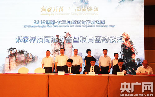 今年以來,張家界正以“五個100”為抓手,圍繞“旅游+現代農業”“旅游+新型工業”“旅游+康體養生”“旅游+文化”等模式,推動一大批重大項目落地生根,中國500強康美藥業進駐張家界、引資總額668億元的19個“旅游+”項目集中簽約、與宋城演藝攜手打造“張家界千古情”、11家省級金融機構千億資金助力綠色項目建設以及總投資15.8億元的12個項目集中開工。2018年上半年,簽約重大招商項目29個,總投資額846億元。