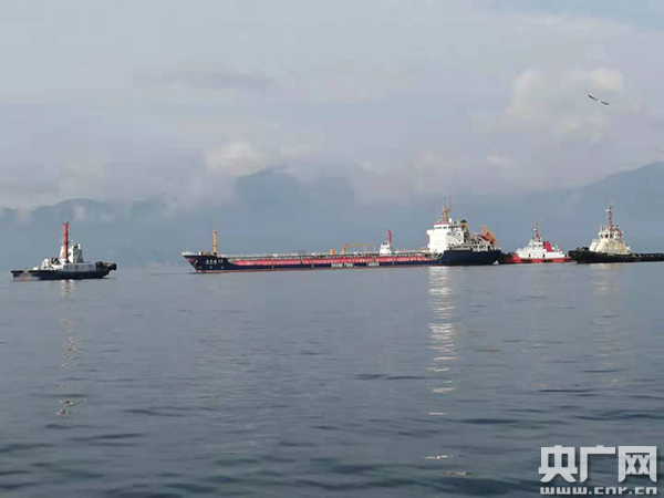 失控船“常豐油12”輪在四艘拖輪拖帶、海事執法船全程護航下起錨進港。(圖片由惠州海事局提供)