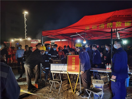 23時許深圳公益救援隊已在附近集合時刻準備支援,他們主要負責救援協助、物資保障等支援工作。凌晨12時30分許,多輛泡沫消防車進入救援現場,與此同時,新一批的深圳公益救援隊已經集結。