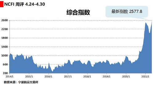 央廣網(wǎng)寧波5月6日消息(記者曹美麗)讓外貿(mào)企業(yè)頭疼的艙位緊張、運(yùn)價(jià)上漲問(wèn)題還在持續(xù)放大。寧波航運(yùn)交易所發(fā)布的海上絲綢之路指數(shù)之寧波出口集裝箱運(yùn)價(jià)指數(shù)(NCFI)顯示:4月24日至4月30日,該指數(shù)報(bào)收于2577.8點(diǎn),較上周上漲7.0%,綜合指數(shù)突破年前高位(2021年1月8日?qǐng)?bào)收于2498.5點(diǎn)),刷新歷史新高。