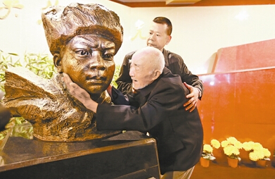 ↑李繼德老人參觀黃繼光紀念館,撫摸著黃繼光雕像激動不已。特約記者孫紹建 攝