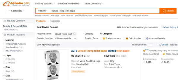 在阿里巴巴國際站輸入“特朗普廁紙”后的結果