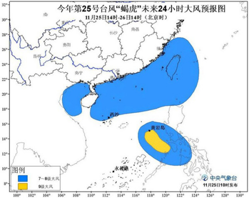大風(fēng)預(yù)報:受“蝎虎”和冷空氣的共同影響,25日14時至26日14時,福建沿海、廣東沿海、海南沿海、臺灣沿海、東海西南部、臺灣海峽、臺灣以東洋面、巴士海峽、北部灣、南海北部和東南部海域的風(fēng)力有7~8級,臺風(fēng)中心經(jīng)過的附近海域風(fēng)力可達(dá)9~10級。